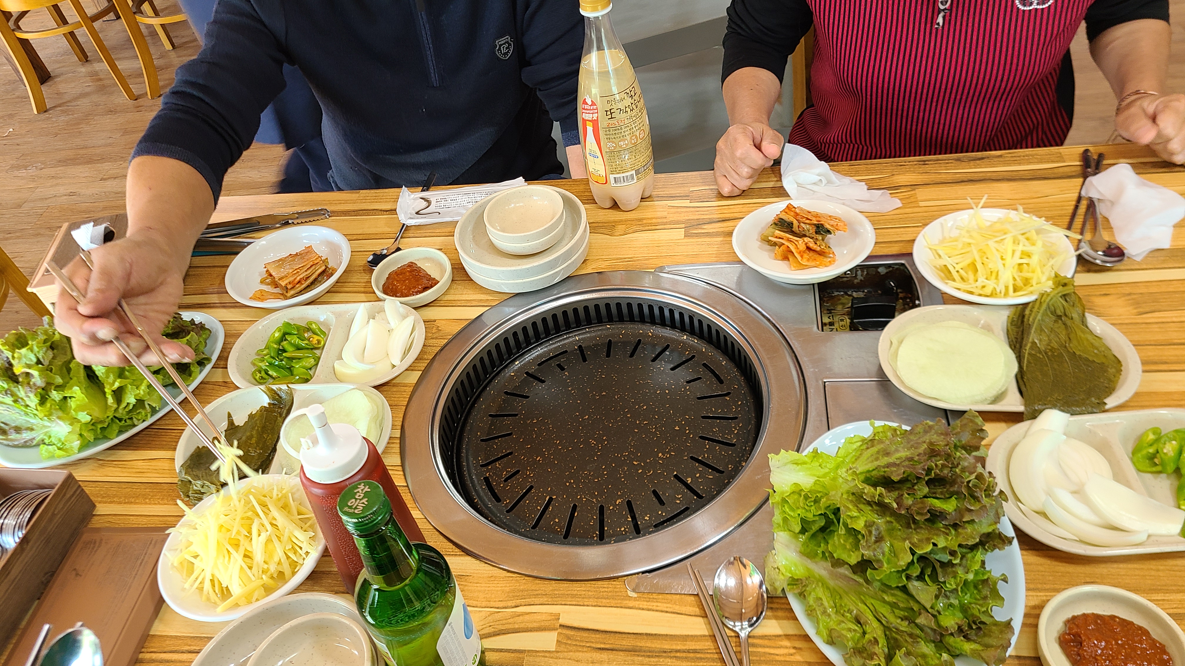 기본상차림입니다. 고추, 양파, 깻잎, 생강, 쌈무, 상추, 김치